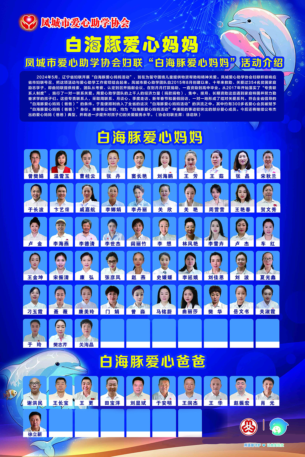 中约有 300 多名爱心会员 被 赋予 “白海豚爱心妈妈(爸爸)”身份。 本展板 公布的,均 为 “白海